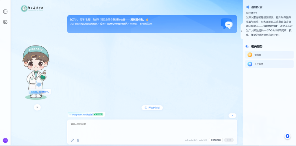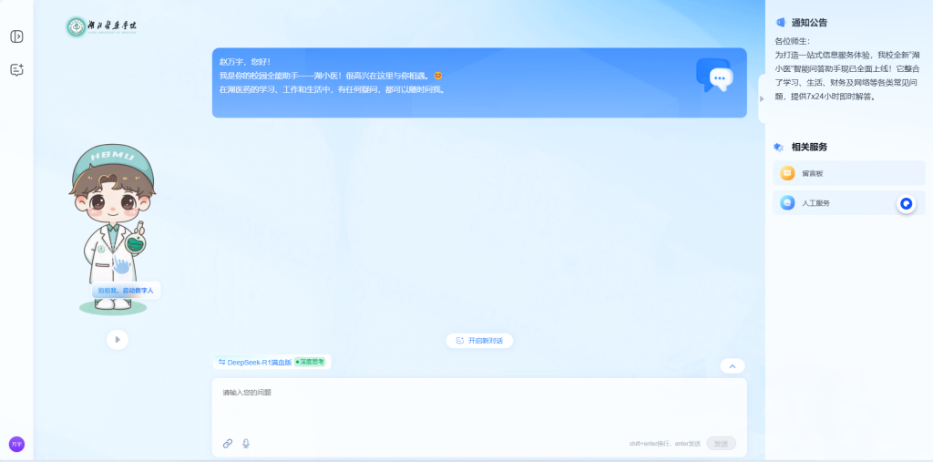 我是校园服务助手“湖小医”,我可以依托学校官方的知识库文档(如学生手册、部门规章、办事指南等),为您精准解答在学生资助、校园服务、网络信息等方面的疑问。无论是校园日常管理、还是资助政策解读,我都会以专业且温暖的姿态,为您提供7×24 小时不间断的精准解答。