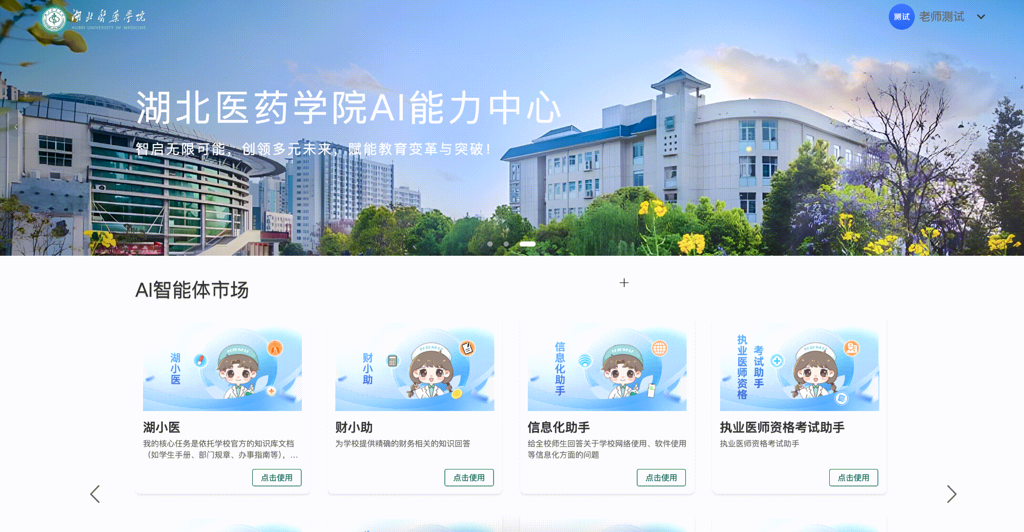 湖北医药学院“AI 能力中心” 的上线,不仅是学校智慧校园建设的重要里程碑,更是对未来教育模式的积极探索。从智能体矩阵的贴心服务,到 AI知识库资源的沉淀再到AI 工具平台的资源赋能,这座 “AI 能力中心” 正以科技之力,为师生搭建起通往创新未来的桥梁。目前,学校AI智能体矩阵尚处于不断学习成长阶段,我们诚邀每一位师生化身 “AI 共建者”参与AI智能体的训练,共同为其注入更多的智慧和活力。让我们共同拥抱这场智能化变革,开启医教融合的全新征程!