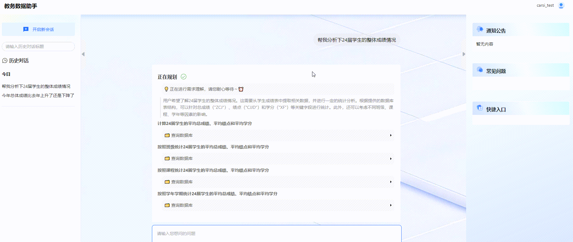 我是“教务数据助手”,我依托AGI 理念与 MCP 技术,能够打破数据壁垒,以自然语言对话来实现数据与AI 的深度交互。从课程数据查询到学生成绩分析,我都能提供全方位、深层次、高价值的AI 数据分析服务。学生可以通过我轻松查询考试成绩、课程课表,教师能通过我来了解教学安排、班级和学生的考试情况,管理人员可以借助我的智能分析功能,多角度的进行数据的对比分析与图表展示。