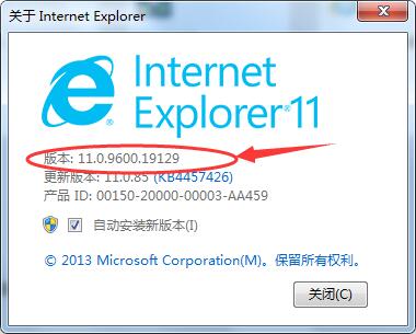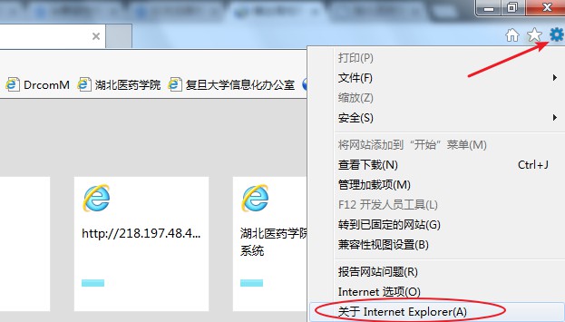 安装完成后,打开的IE浏览器,点击右上角的“工具”,在菜单选择“关于Internet Explorer”,查看IE版本。