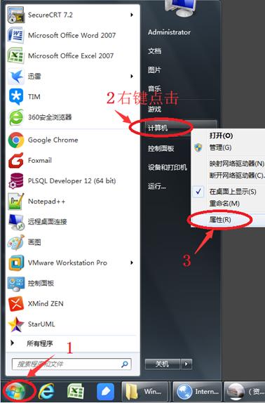 win7:点击左下角图标 ——右键点击“计算机”——在弹出菜单中点击“属性”